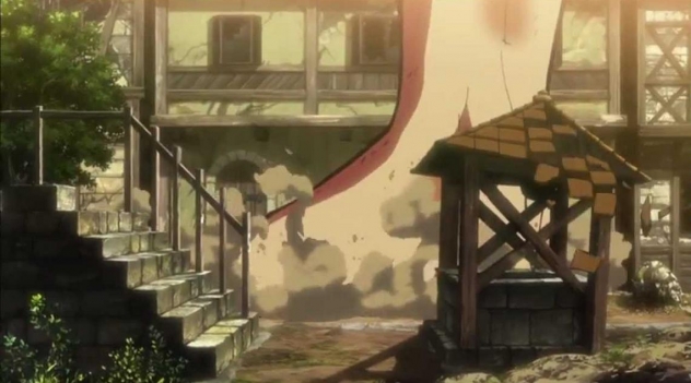 本作特有的戰鬥特色,以擺盪的固定繩索與噴氣得以讓故事中使用者行動在空中與巨人一戰的「立體機動裝置」更能透過動畫完整的呈現,將垂直空間戰鬥的華麗和高速移動的強烈機動性毫無保留的表達給觀看者。單就第一話而言,可見的外部條件無論是視覺還使聽覺的享受都是沒話說的高品質質感。